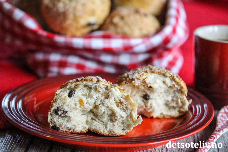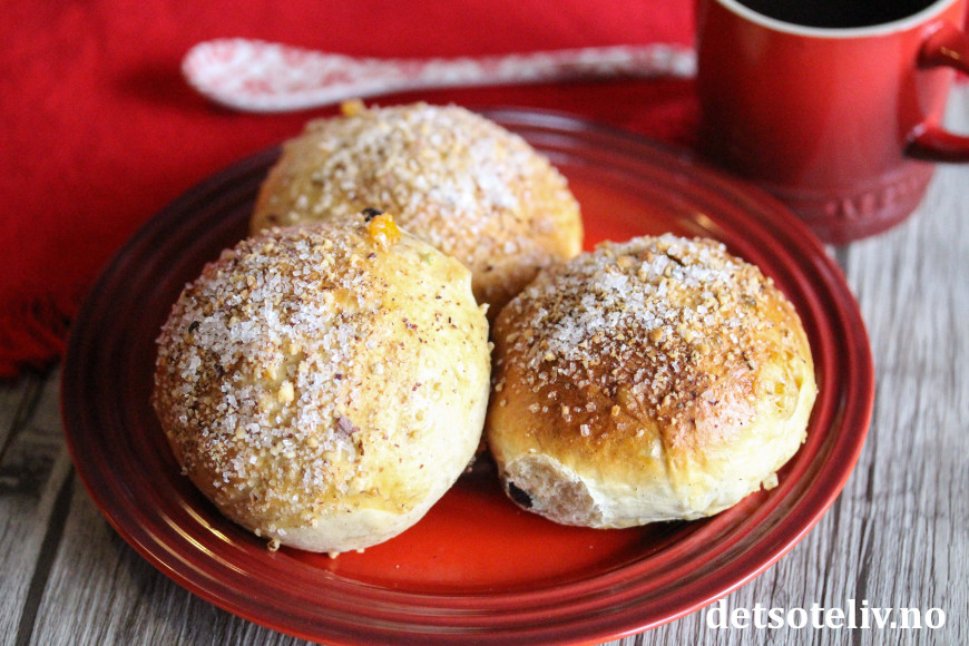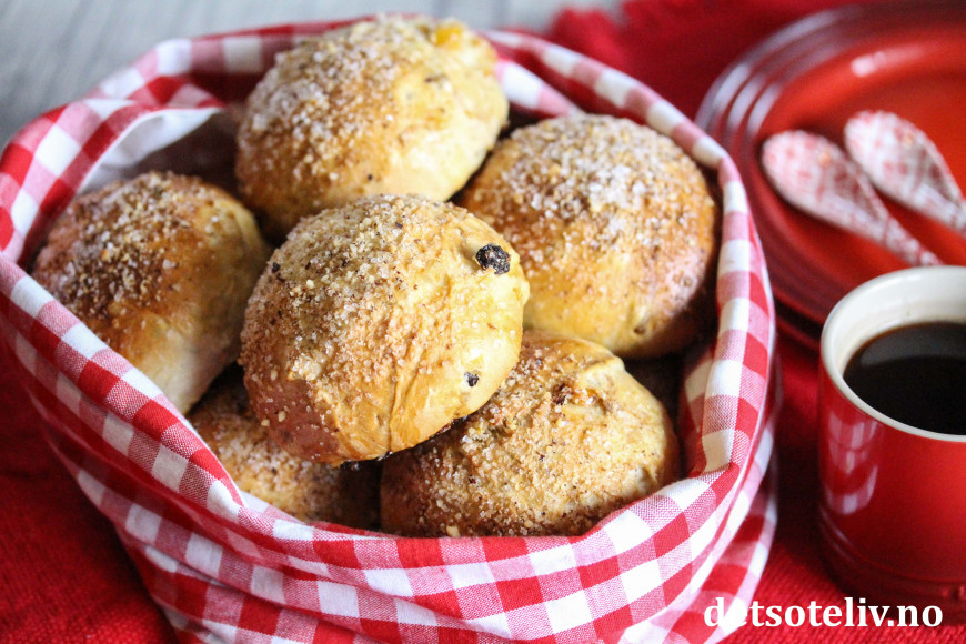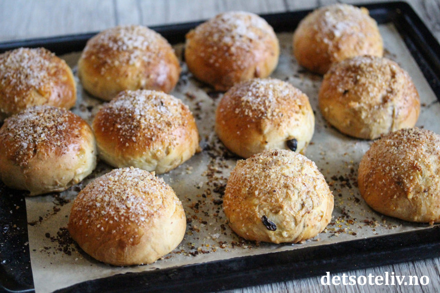 ♥ Liker du nøtter, kan du gjerne hakke 100 g hasselnøtter og kna dette inn i deigen sammen med rosinene.