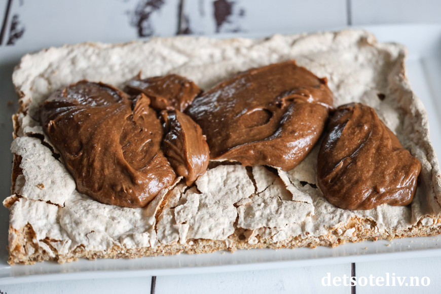 Fordel sjokoladekrem over mandelbunnen. Legg på den andre mandelbunnen.
