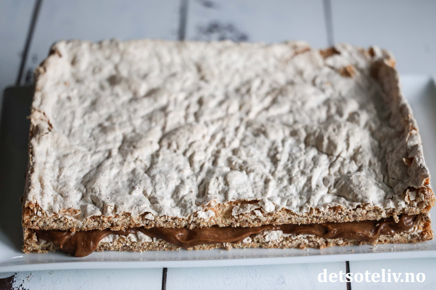 Stek kaken midt i ovnen ved 180°C i 25 - 30 minutter. La kaken avkjøles helt i langpannen. Deretter hvelves kaken ut av langpanne. Fjern bakepapiret og del kaken på midten så du får to firkantede kakebunner.