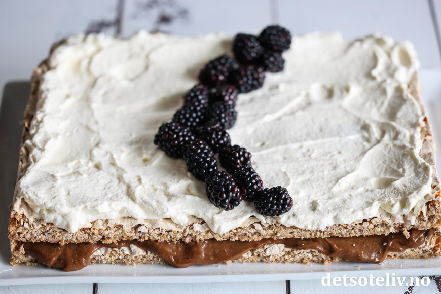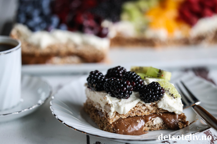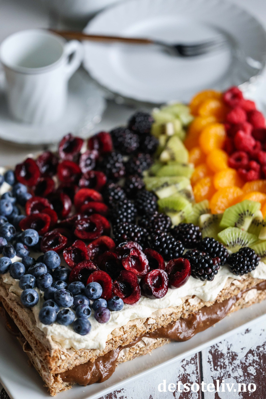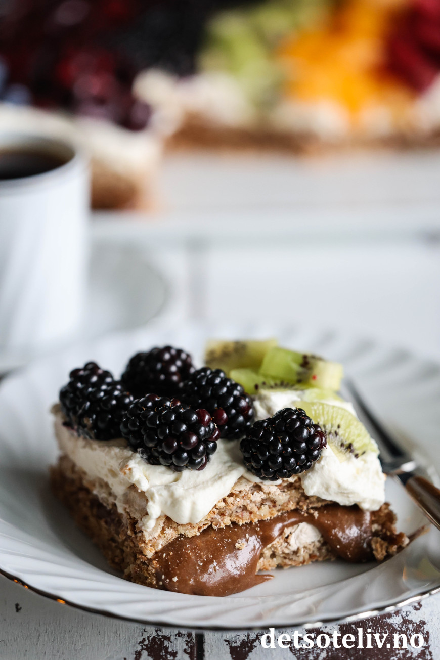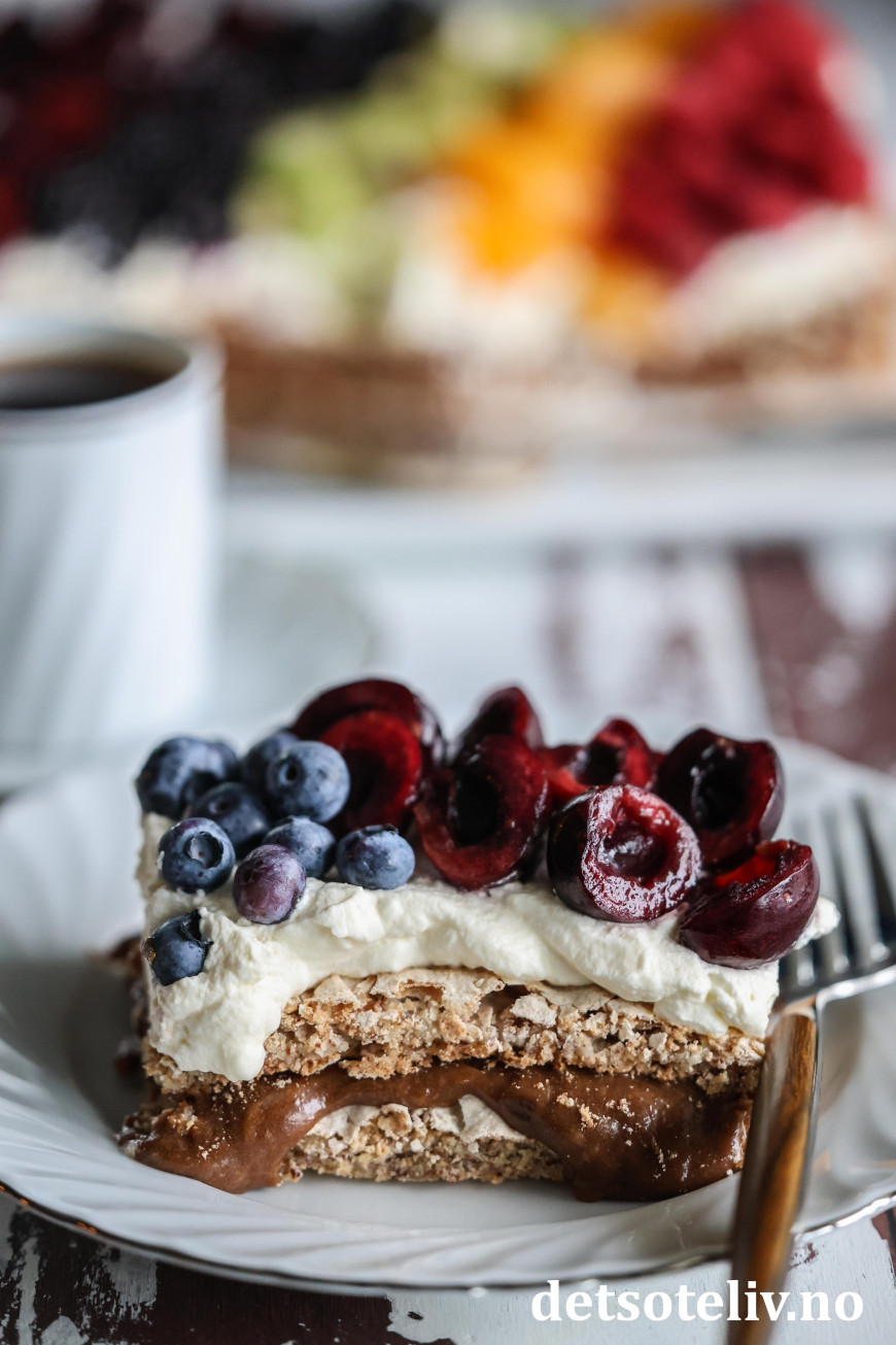 Elsker den deilige smaken av sjokolade og kaffe på sjokoladekremen i kombinasjon med seige, myke mandelbunner, pisket krem og masse frukt og bær!
