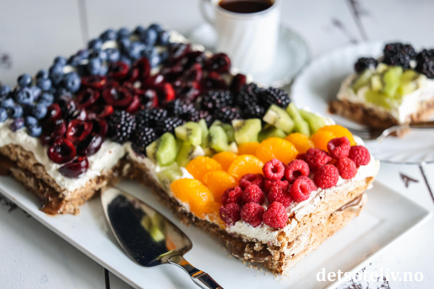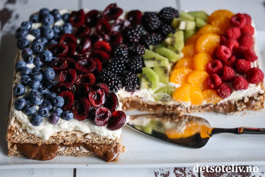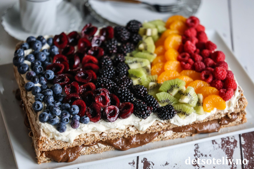 Pynt kaken med masse frukt og bær, og gjerne lagt på kaken i et sikk sakk-mønster.