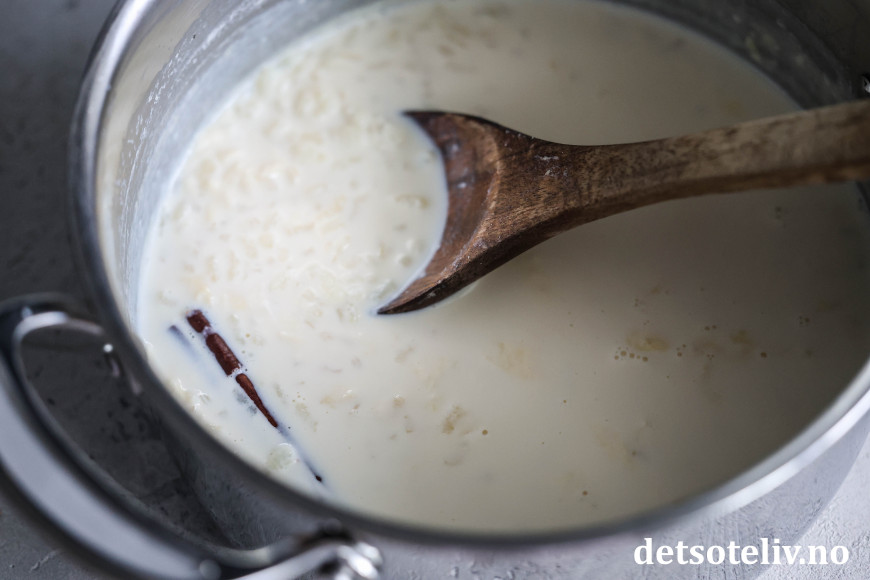 Gi melken et oppkok. Senk straks varmen på platen og la melkesuppen småkoke uten lokk på lav varme i ca. 40–50 minutter. Rør jevnlig i kjelen slik at melken og riskornene ikke svir seg i bunnen av kjelen.
