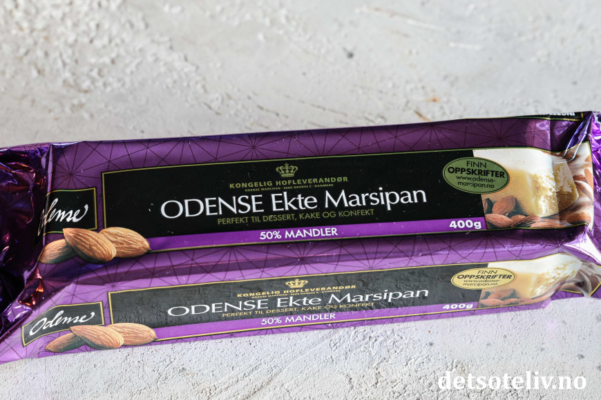 ♥ Til kakebunnene er det helt nødvendig at du bruker ekte marsipan, som er marsipan med minst 50% mandelinnhold. Marsipan med lavere mandelinnhold tåler ikke steking og gir feil konsistens på kakebunnene. Jeg bruker lilla rull fra Odense, som fås kjøpt i de fleste matbutikkene.