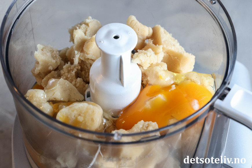 Del marsipanen i biter og ha i en food processor. Tilsett eggene.