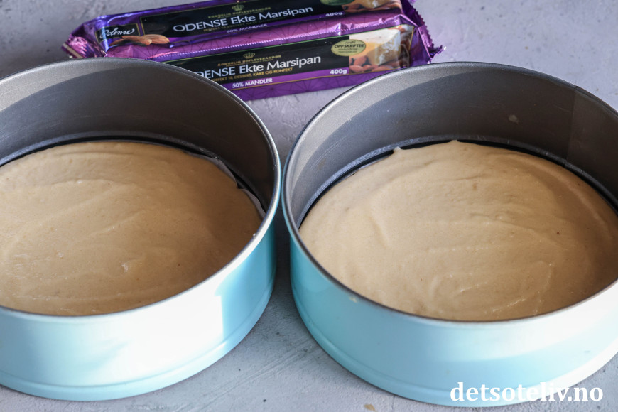 Dagen før servering lager du marsipankakebunnene med fyll: