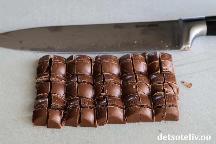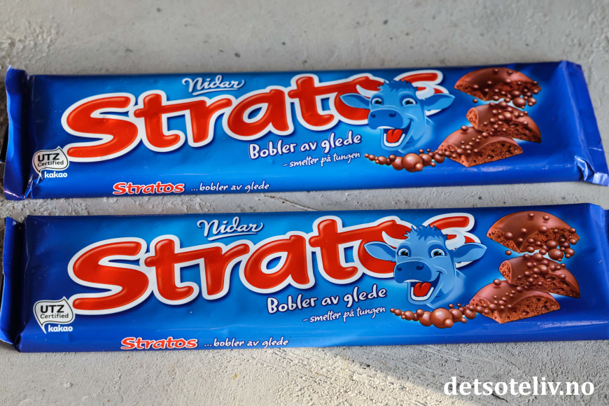 ♥ Stratos er en populær melkesjokolade med luftbobler! 😊 Du bruker til sammen to store plater (à 150 gram) til denne kaken. Hvis du synes det blir for voldsom med så mye sjokolade, kan du nøye deg med 1 stor Stratos i fyllet og eventuelt bare drysse litt hakket sjokolade på toppen av kaken.