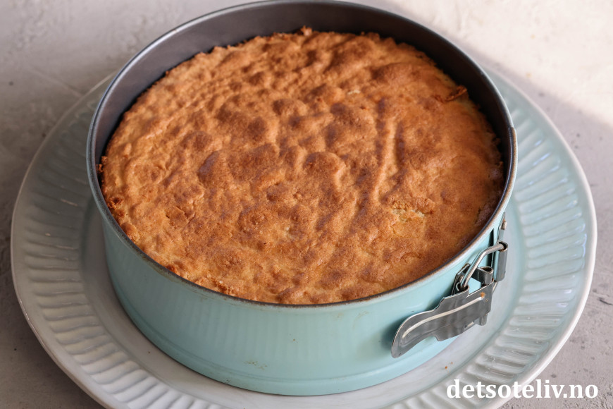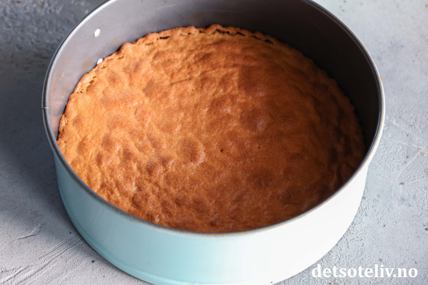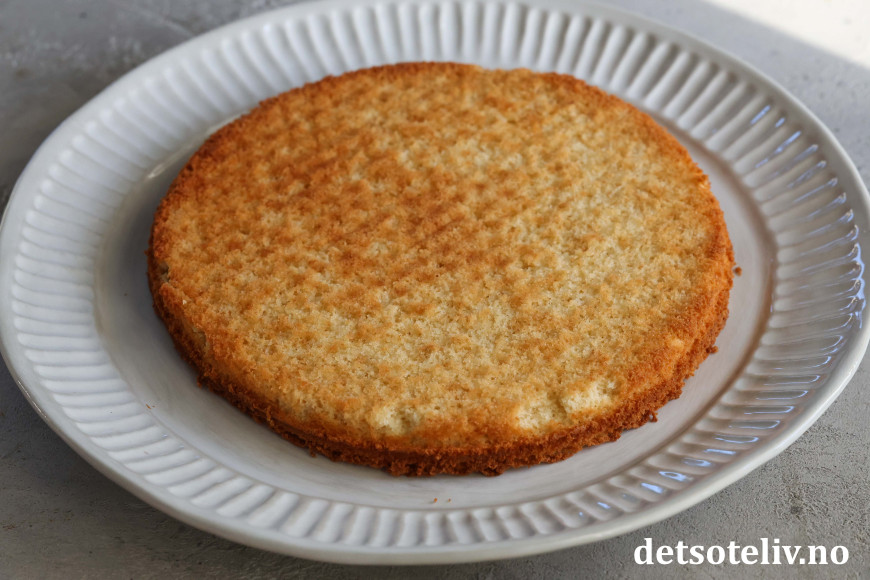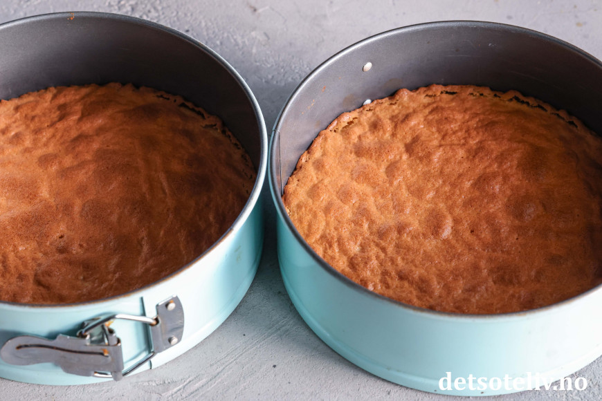 Fordel deigen i to små kakeformer (20 cm i diameter) med bakepapir i bunnen. Stek kakene midt i ovnen ved 180°C i ca. 20 minutter. La kakene avkjøles helt i kakeformene.