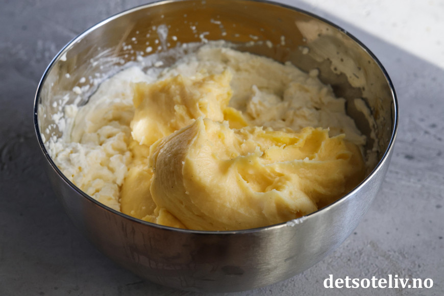 ♥ Til fyllet bør du helst bruke Hjemmelaget vaniljekrem, som du finner kjempebra oppskrift på her på Det søte liv. Jeg gjengir oppskriften raskt nedenfor. Hvis du imidlertid velger ferdigkjøpt vaniljekrem, må du være nøye på å røre minst mulig i den. Bare vend pisket krem og hakket Stratos forsiktig inn i vaniljekremen med en slikkepott. Hvis du rører for mye, vil ferdigkjøpt vaniljekrem kunne bli for tynn i konsistensen.