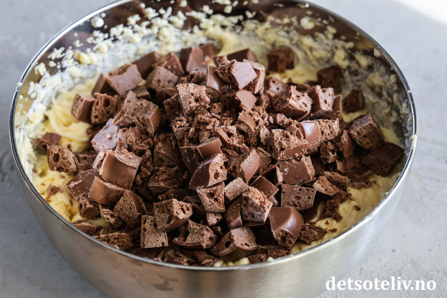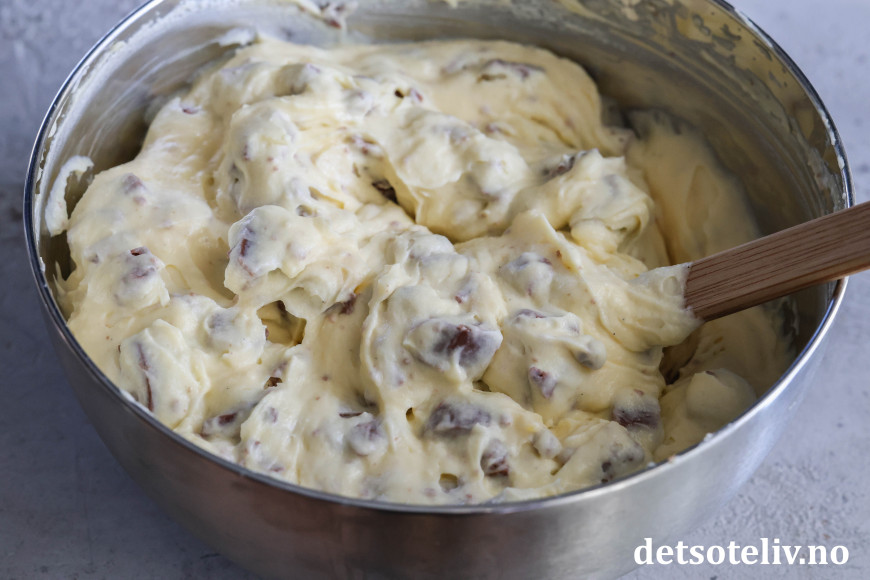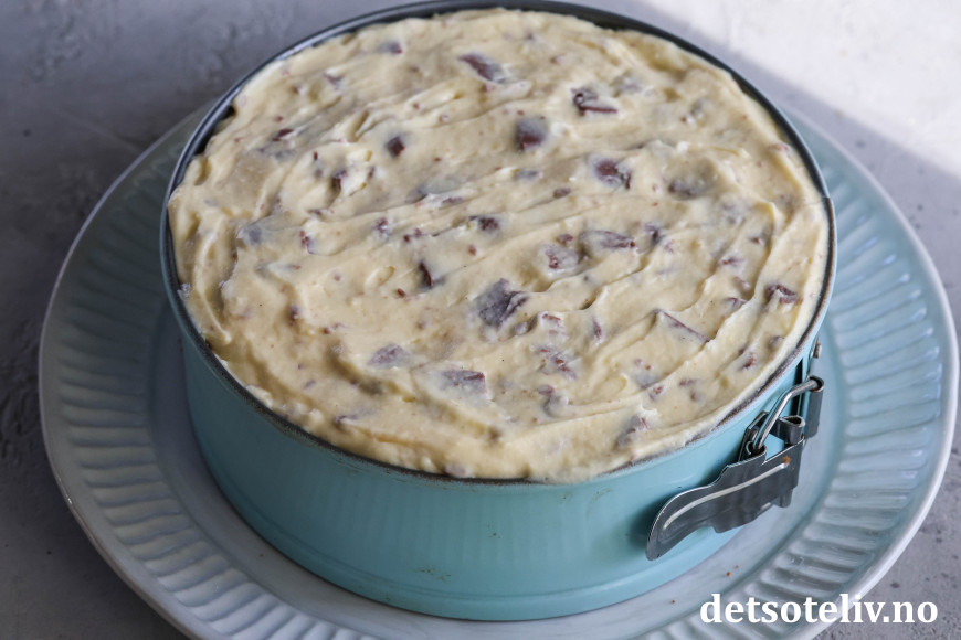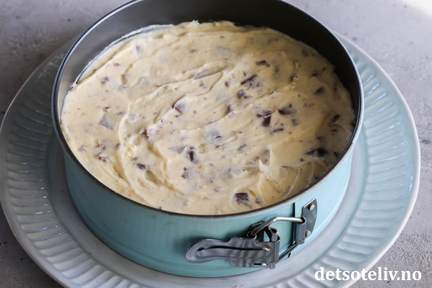 Dekk med resten av vaniljekremen med sjokoladebitene.