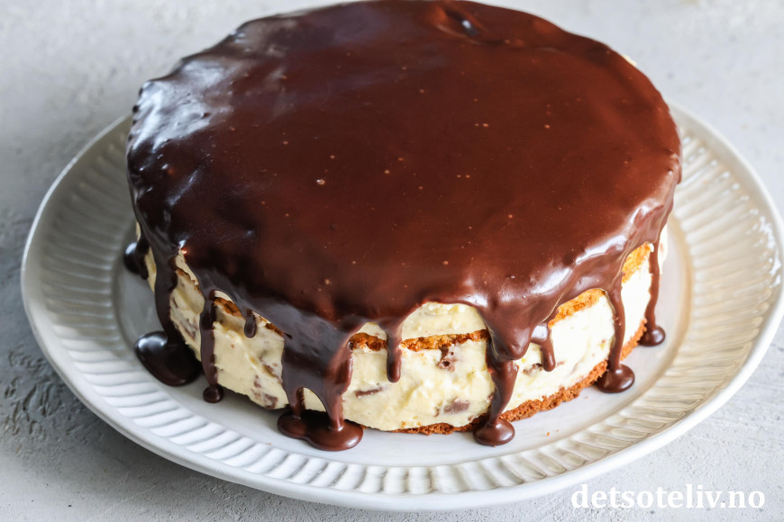 Øs den tykke sjokoladeglasuren forsiktig over toppen av kaken og la den renne litt nedover langs kantene.