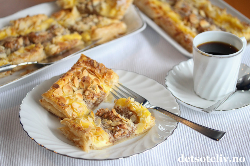 Her har jeg lagt butterdeigsplater etter hverandre slik at de danner lekre wienerbrødstenger. Jeg har brukt makrondeig og vaniljekrem som fyll, som smaker fantastisk godt, men fyllet kan du variere etter ønske.