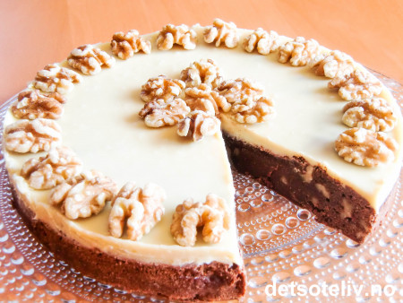 Løsne kaken fra formen med en tynn kniv. Ta den ut av formen og dra av bakepapiret fra undersiden. Sett kaken på et kakefat og pynt med hele valnøttkjerner.