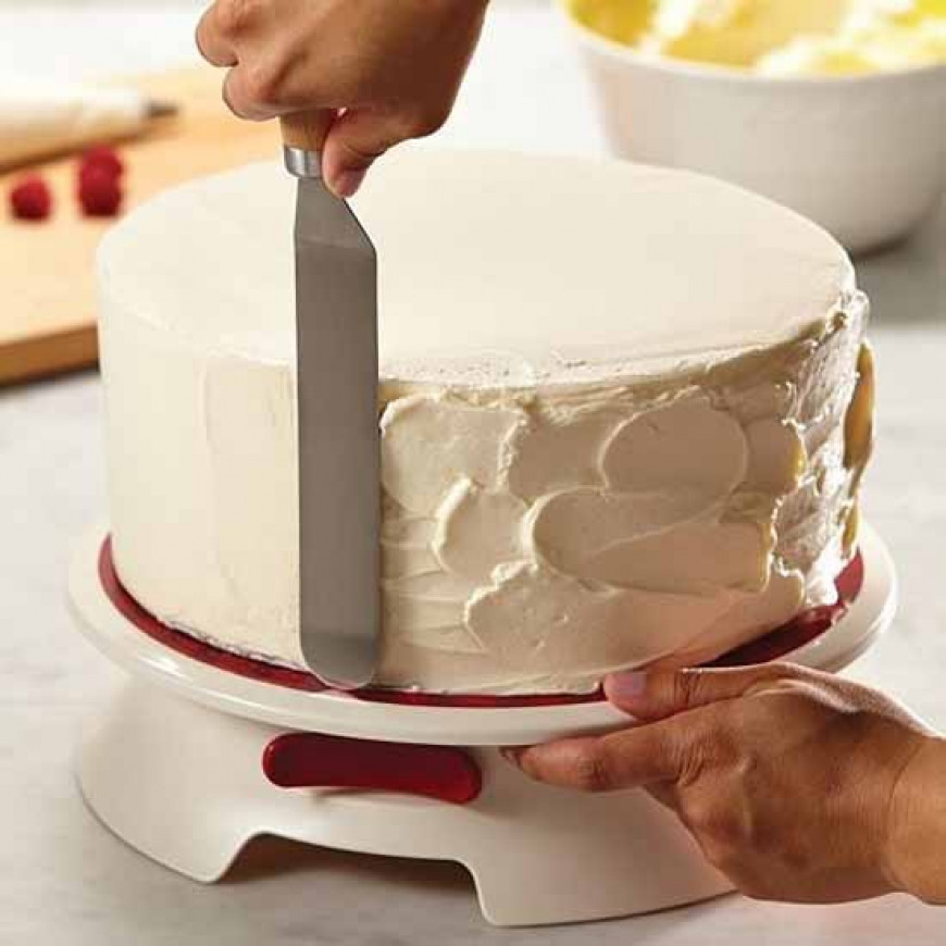 Det fine med denne kakedreieren er at du selv kan velge når du vil at den skal snurre rundt eller stå bom fast. Dette er praktisk for å få glatte, jevne overflater på kaker.