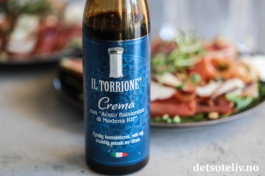 ♥ Crema di balsamico (Balsamico glaze) er en søt, tyktflytende glaze laget på balsamicoeddik og fås kjøpt i de fleste velassorterte, norske matbutikkene. For hjemmelaget balsamico glaze, se oppskrift på Redusert Balsamico.