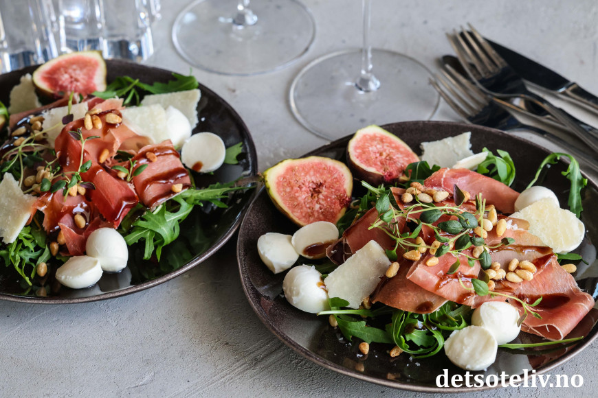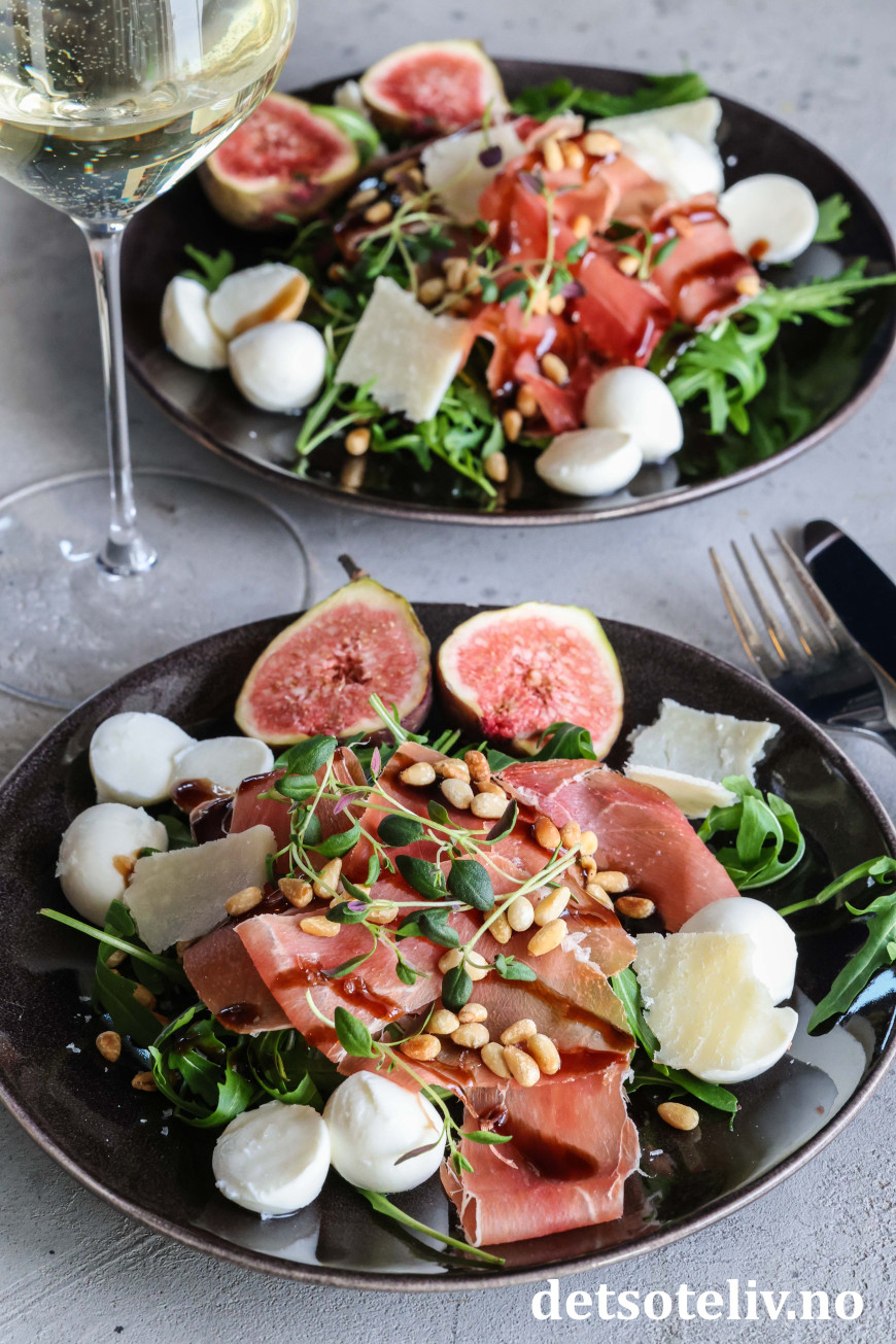 Det er gode, italienske råvarer som står i sentrum: Ferske fiken legges på ruccolasalat sammen med god spekeskinke og fersk mozzarella. Tallerkenen toppes med olivenolje, søt balsamico glaze, friske urter, ristede pinjekjerner og høvlet parmesan.