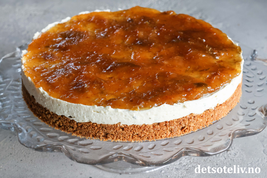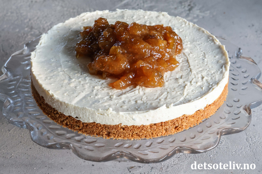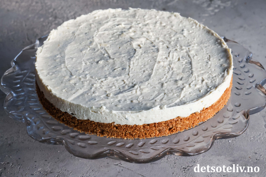 Ta fatet ut av kjøleskapet. Fordel ostekremen over pepperkakebunnen innenfor kakeringen. Sett fatet tilbake i kjøleskapet i minst 2 timer (eventuelt lenger).