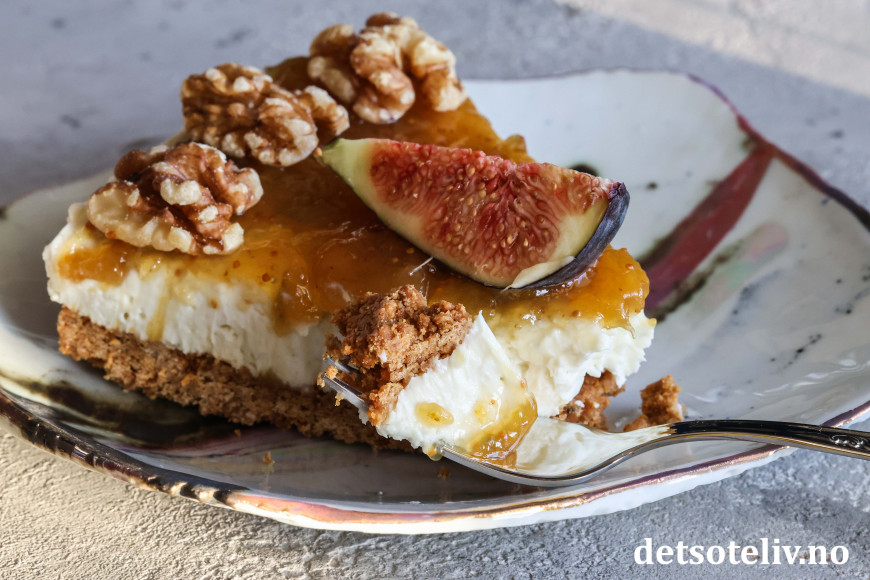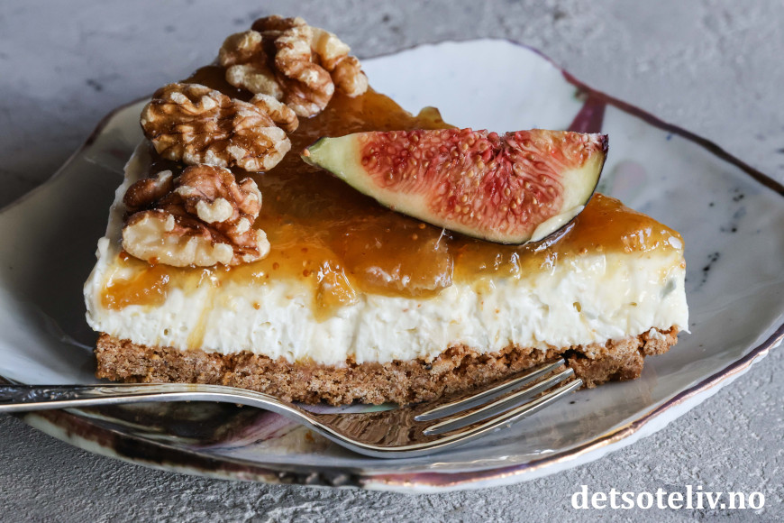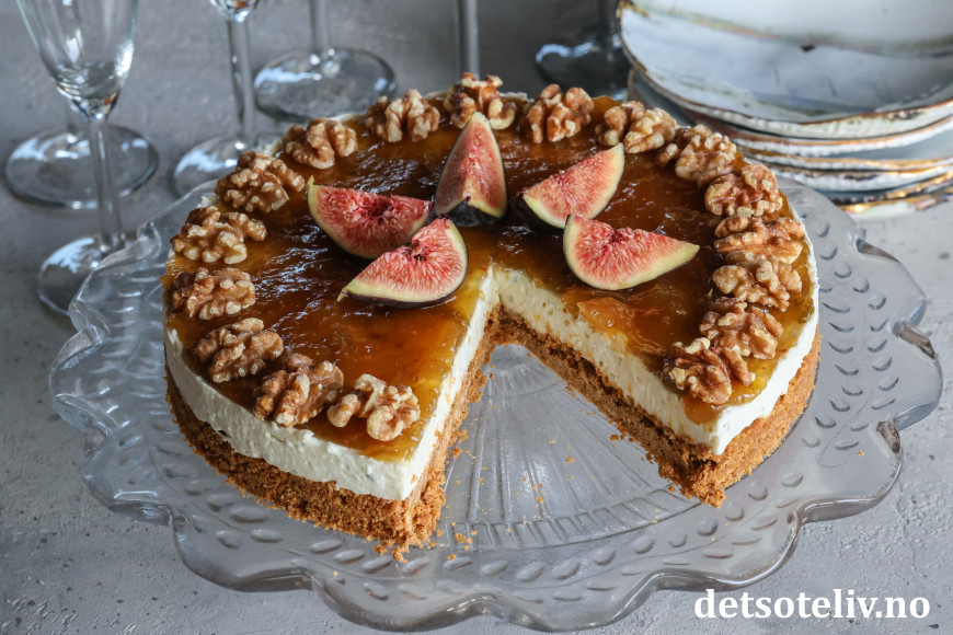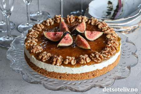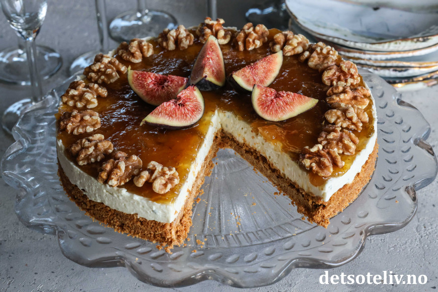 Kaken toppes med fikenmarmelade og pyntes med ferske fiken og valnøtter.
