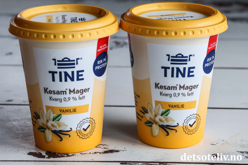 ♥ Vaniljekesam fås kjøpt i de fleste matbutikkene. Jeg brukte her mager type vaniljekesam (2 pk à 420 gram som tilsvarer ca. 8 dl). Vaniljekesam har søt og god smak av vanilje, derfor er det ikke nødvendig med så mye sukker i fromasjen.