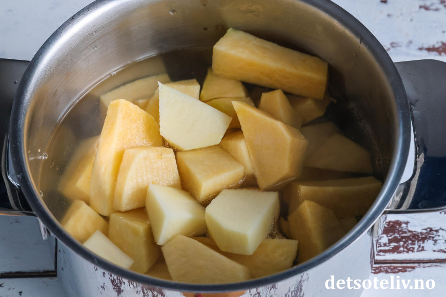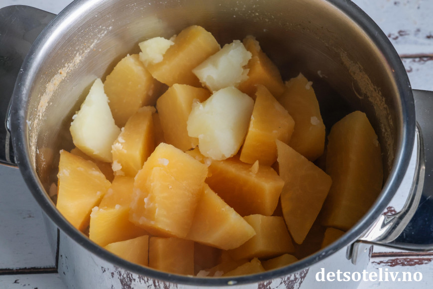 Skrell kålrot og potet og mål opp angitt vekt. Skjær i mindre biter og ha i en kjele med vann. Kok bitene til de her helt møre.