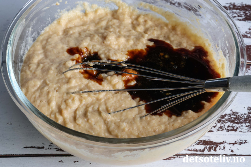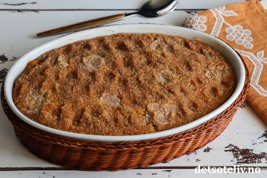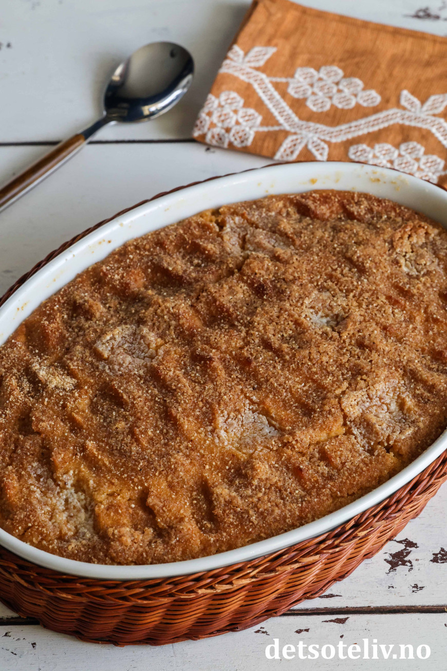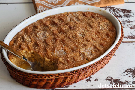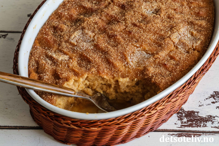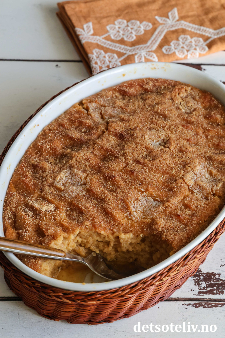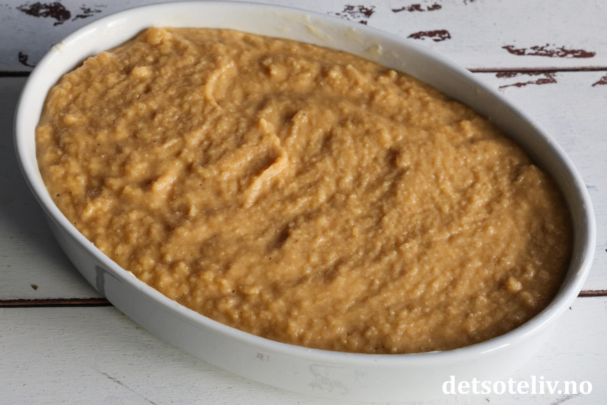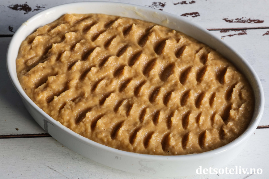 Ha blandingen i en godt smurt ildfast form som rommer ca. 2 liter.