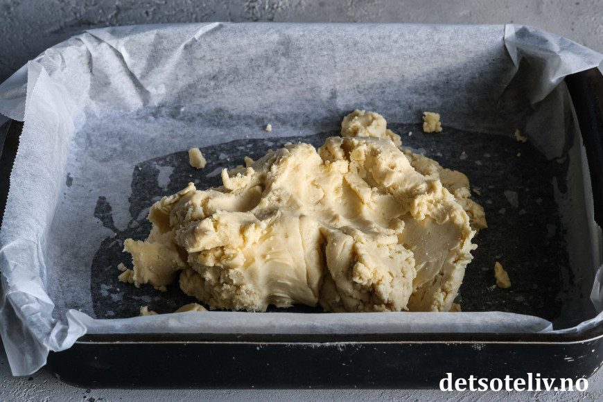 Klem deigen utover i bunnen på en liten, bakepapirkledd langpanne (ca. 20 x 30 cm).