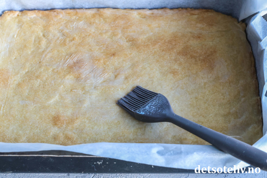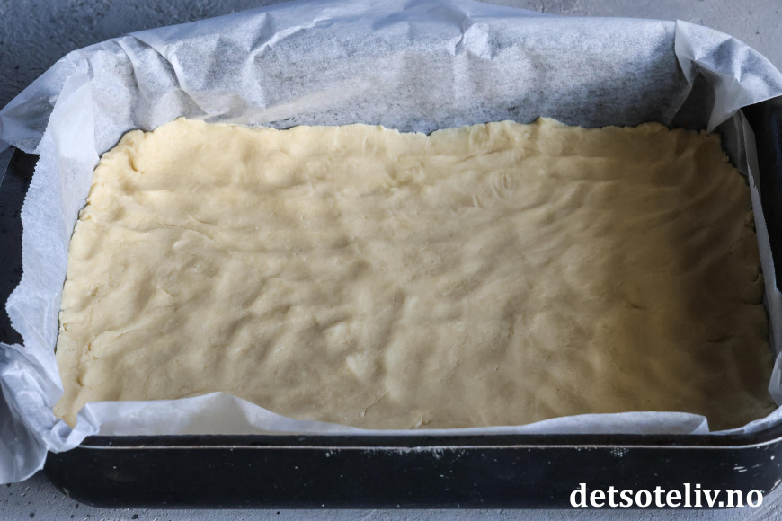 Ha fyllet øver mørdeigsbunnen i langpannen.