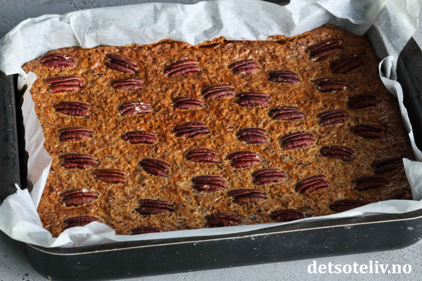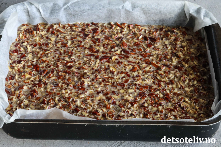 Ha fyllet øver mørdeigsbunnen i langpannen, og legg de pene pekannøttene oppå fyllet i et pent mønster.