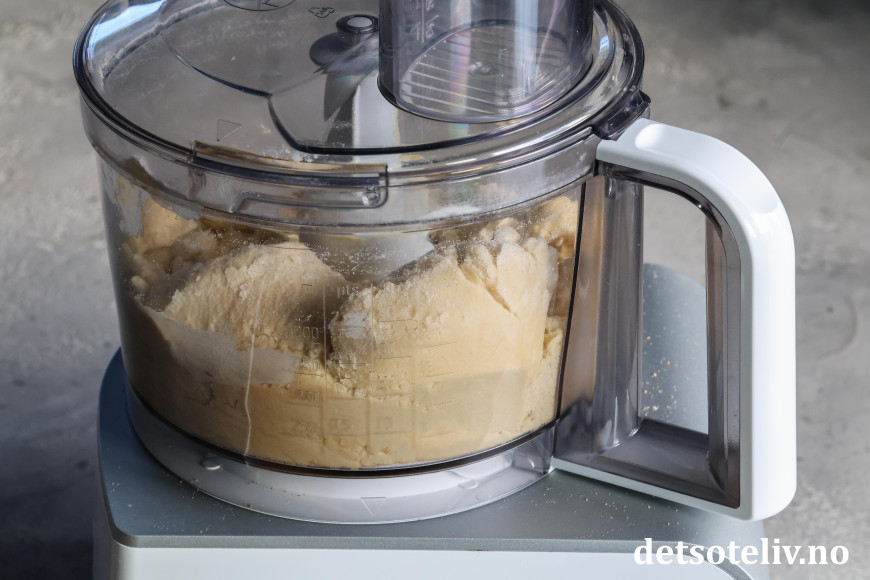 Kjør deigen raskt sammen. (Har du ikke food processor, kan du først blande mel og sukker og deretter smuldre smøret inn med fingrene. Kan deigen raskt sammen.)