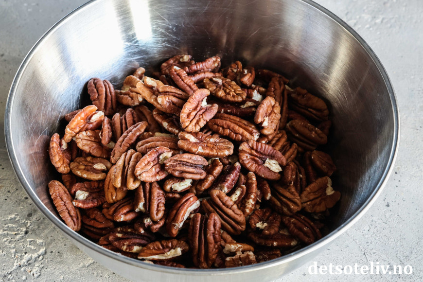 Mål opp 400 g pekannøtter. Plukk ut 100 g pene pekannøtter til pynt. Hakk resten fint.