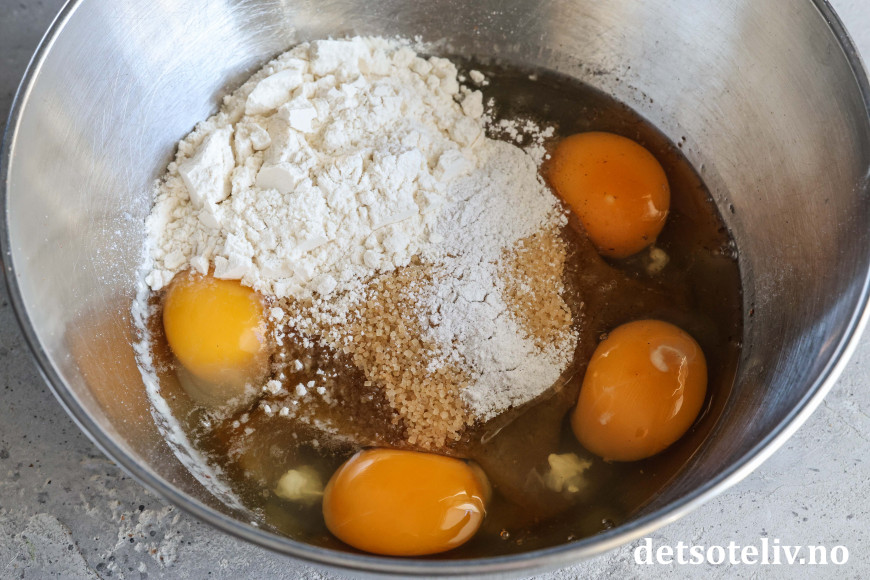 Pisk eggene til nøttefyllet lett sammen med brunt sukker, hvetemel og vaniljesukker.