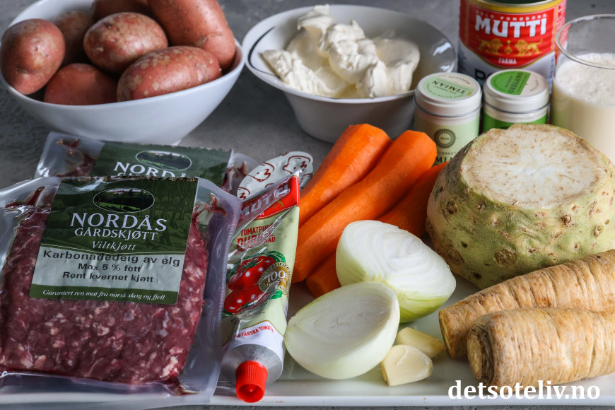 Her brukes elgkjøttdeig og rotgrønnsaker i en smakfull, tomatbasert kjøttsaus. Kjøttsausen legges lagvis i en ildfast form sammen med tynne potetskiver. Så heller man over fløte og drysser over revet ost. Dette stekes i ovnen til potetene er møre og gratengen har fått en sprø og gyllen overflate.