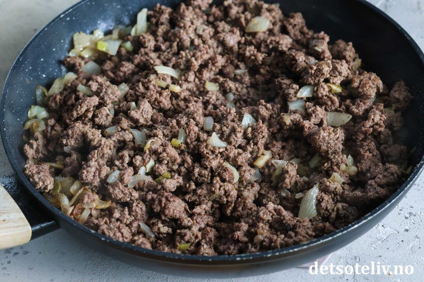 La dette steke på middels varme til løken er myk og kjøttdeigen er gjennomstekt.