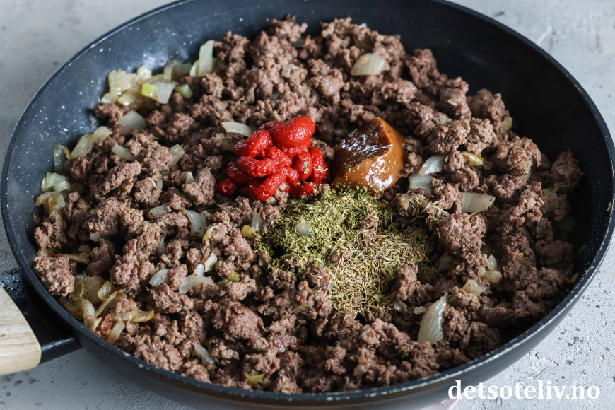 Tilsett tomatpuré, tørket oregano, tørket timian og kjøttfond.