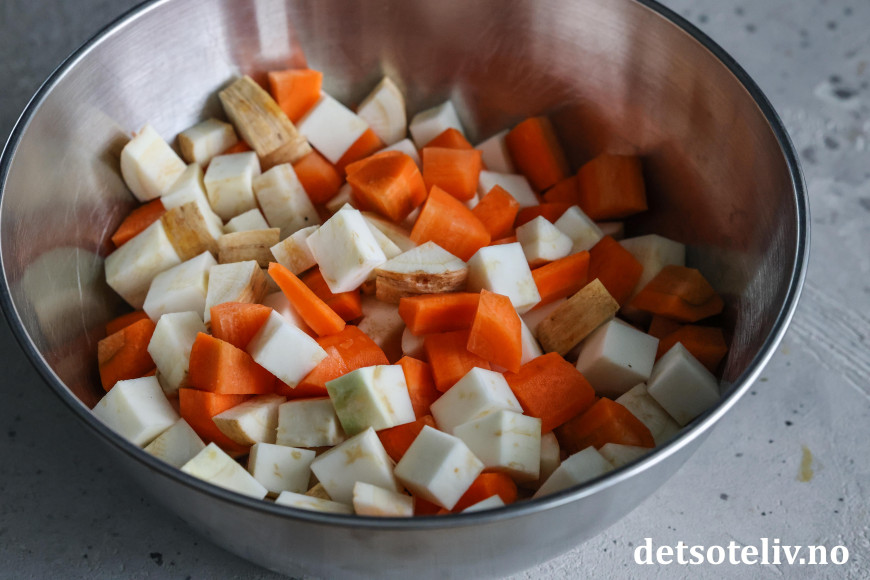 Rens og kutt gulrøtter, sellerirot og persillerot opp i terninger (vei opp 200 gram av hver).