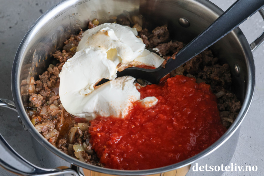 Tilsett hermetiske tomater, 2 dl vann (bruk vannet til å skylle ut tomatboksen) og crème fraîche.