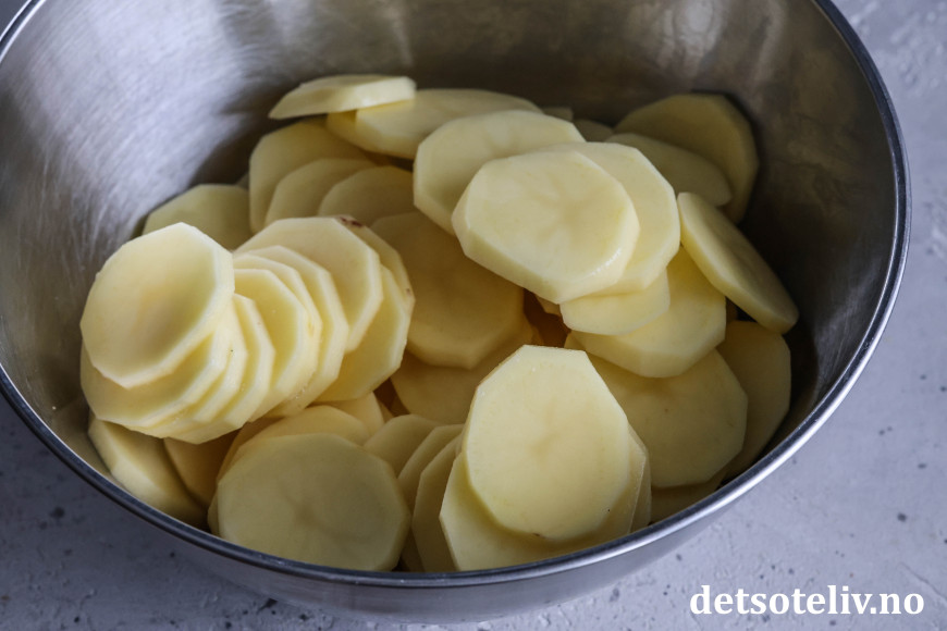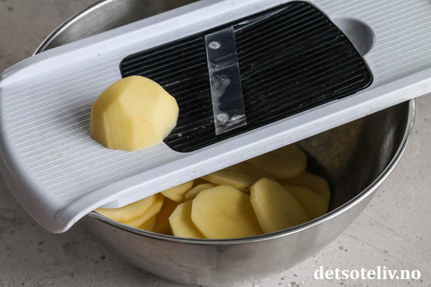 Skrell potetene. Skjær dem i skiver (bruk gjerne en mandolin til dette hvis du har).