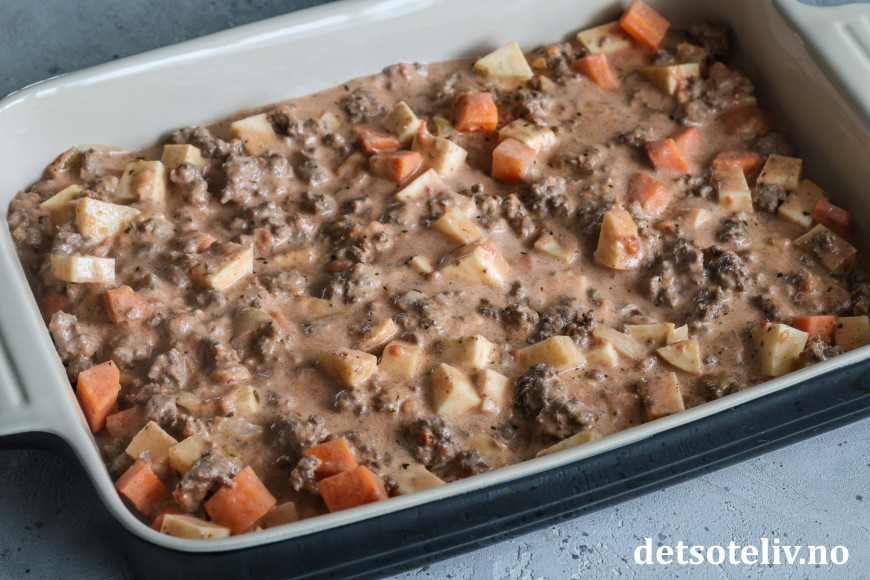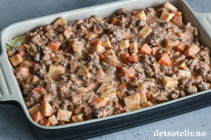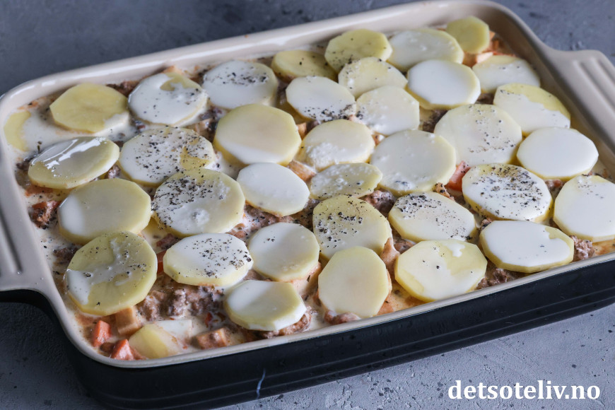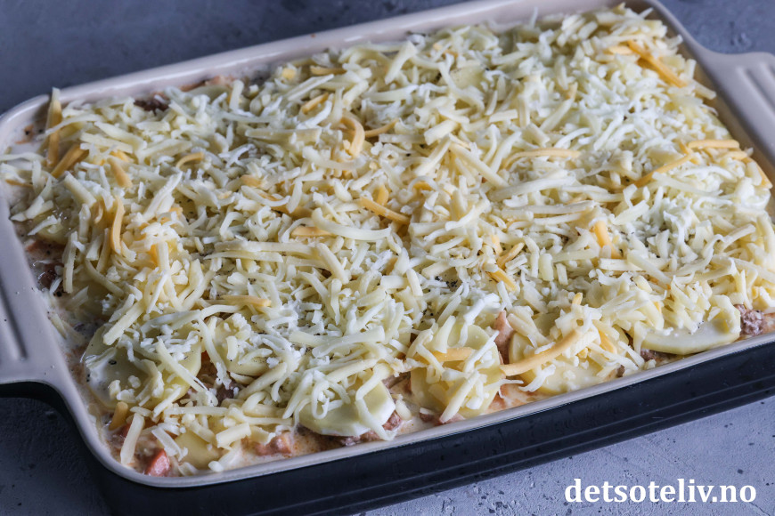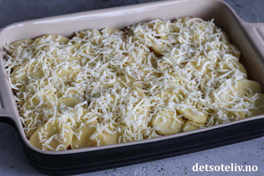 Finn frem en stor, ildfast form (formen jeg brukte her har målene 39 x 25 cm). Legg halvparten av kjøttsausen i formen. Dekk med potetskiver. Fordel over revet ost. Ha over resten av kjøttsausen. Dekk med resten av potetskivene. (Kvern eventuelt over litt ekstra salt og pepper.)