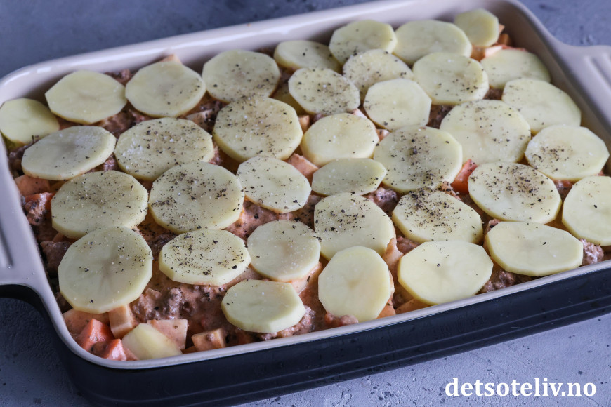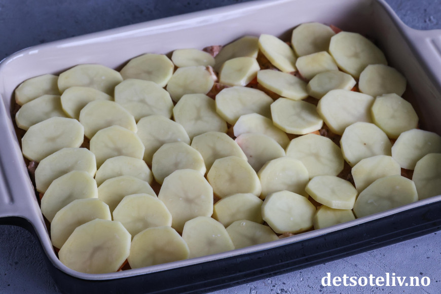 Dekk med resten av potetskivene. (Kvern eventuelt over litt ekstra salt og pepper.)