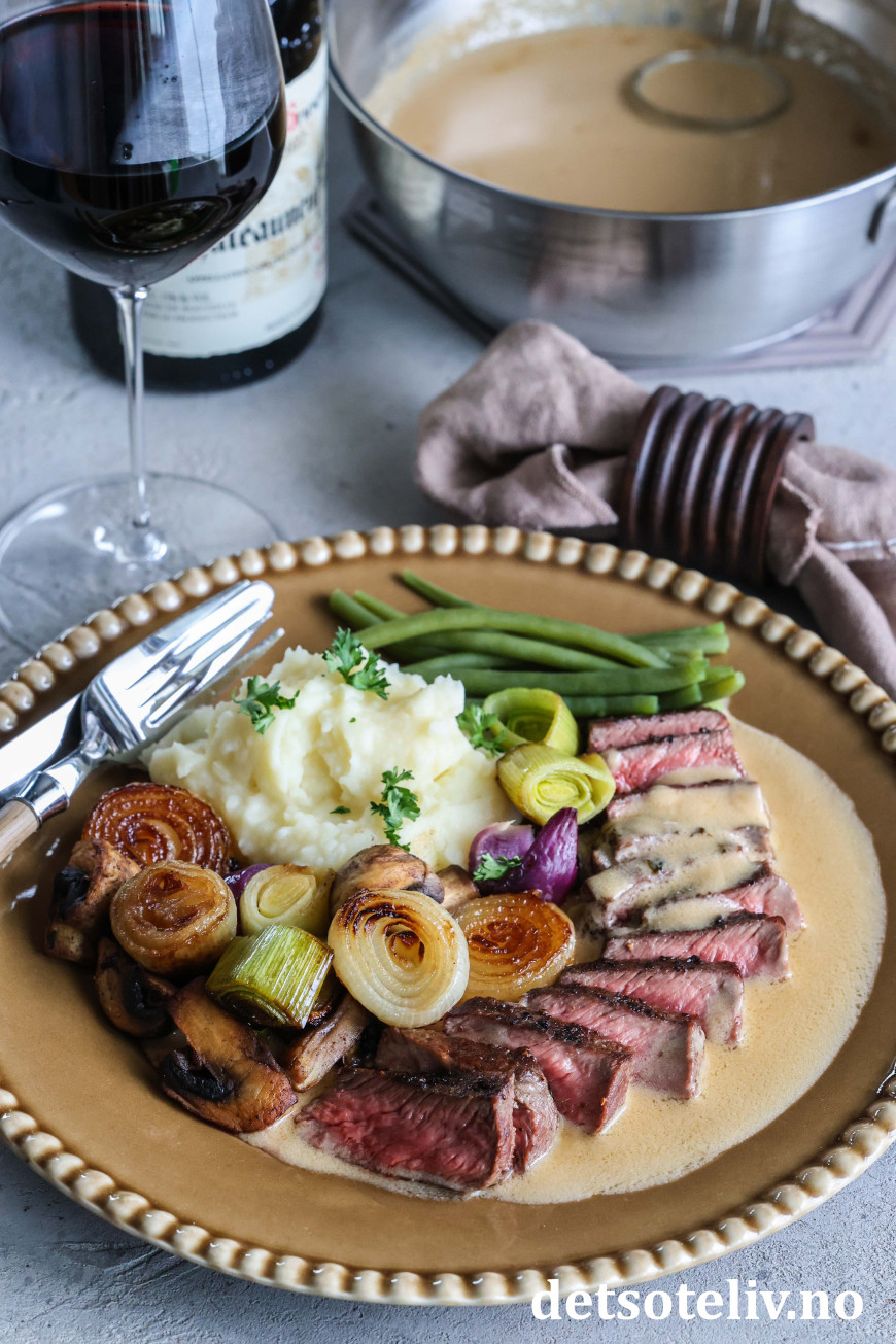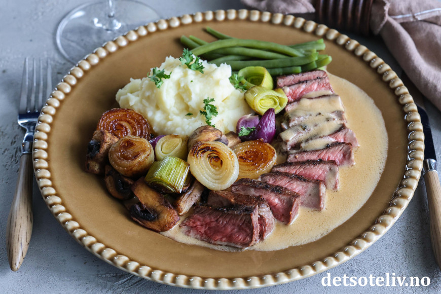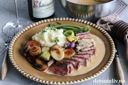 Server sammen med blandingen av stekt løk og sopp, aspargesbønner og hjemmelaget potetmos. Øs over den deilige konjakksausen.