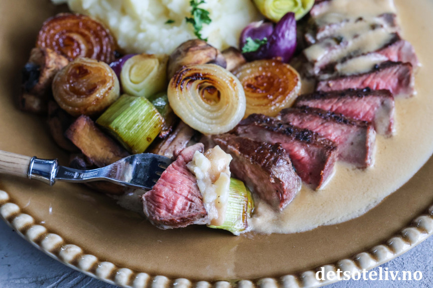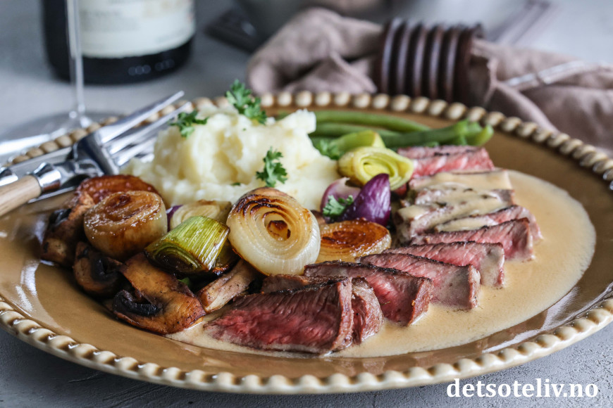 Her serveres stekt ytrefilet sammen med stekt løk (jeg bruker her en kombinasjon av rødløk, purreløk og sjalottløk), smørstekte sopp, aspargesbønner og nydelig, hjemmelaget potetmos. Det er imidlertid den knallgode Konjakksausen som virkelig gjør susen! 😍