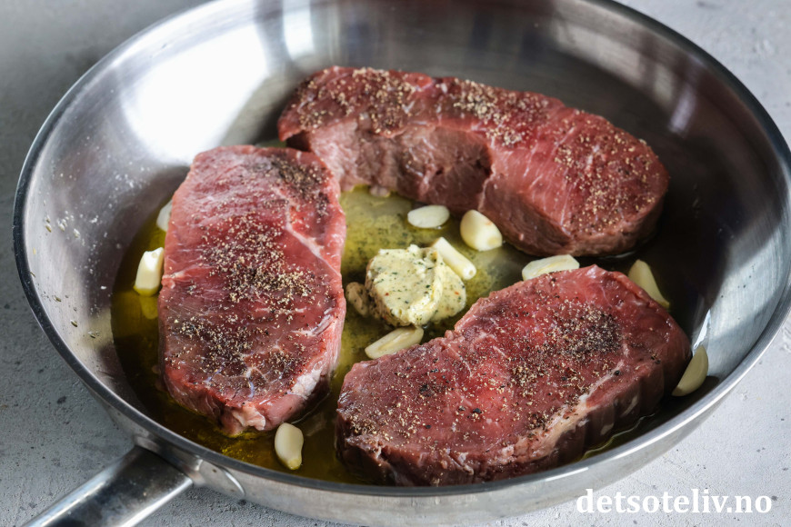 Ha biffene i en stekepanne med olje, smør (jeg brukte kryddersmør denne gangen) og store biter hvitløksfedd. Krydre godt med kvernet salt og pepper.