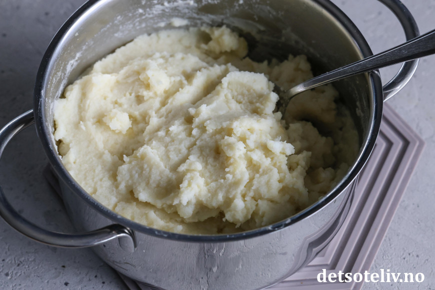 Mos de varme potetbitene med en potetstamper. Ha først i smøret i kjelen, og bruk potetstamperen til å mose smøret jevnt inn i den varme potetmosen ettersom det smelter. Ha så i melken. Bruk nå en tresleiv eller lignende til å røre inn melken (tilsett litt ekstra melk dersom du synes den er for tykk).