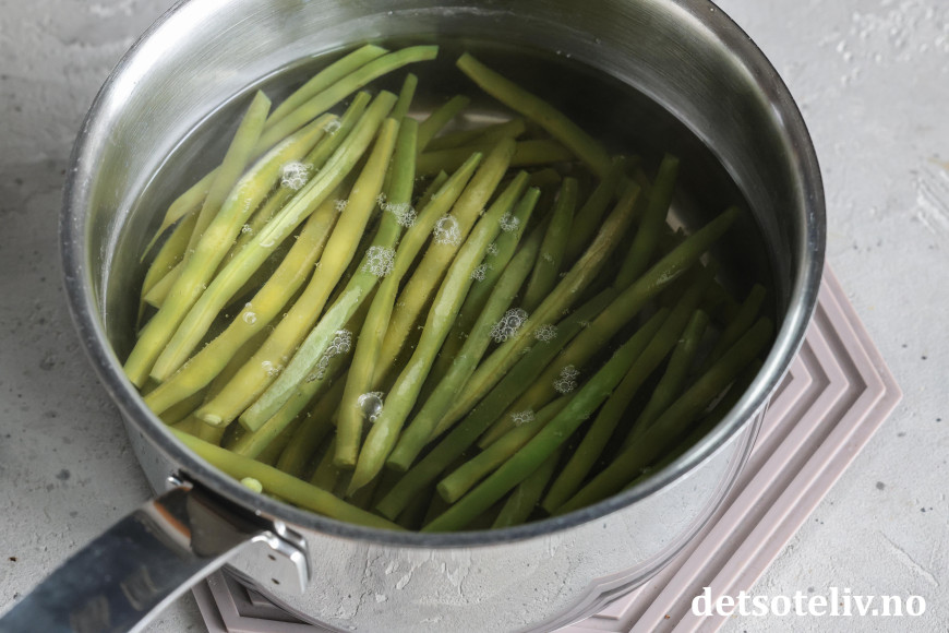 Kutt av tuppene på aspargesbønnene og kok dem i lettsaltet vann i et par minutter. De skal være gjennomkokte, men ikke for bløte. Hell av vannet.