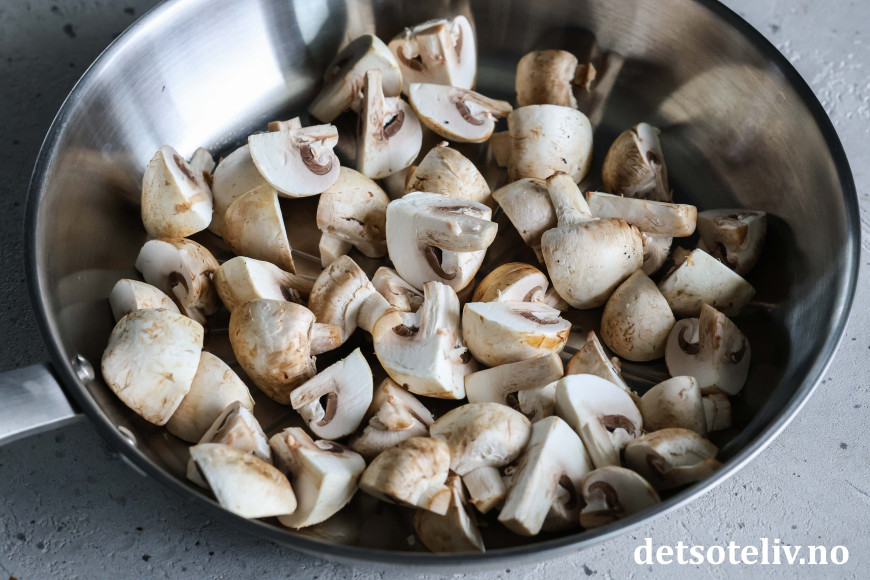 Rens soppen og skjær i store biter. Ha soppen i en annen panne med 2 ss smør. La soppen steke på middels varme i noen minutter.