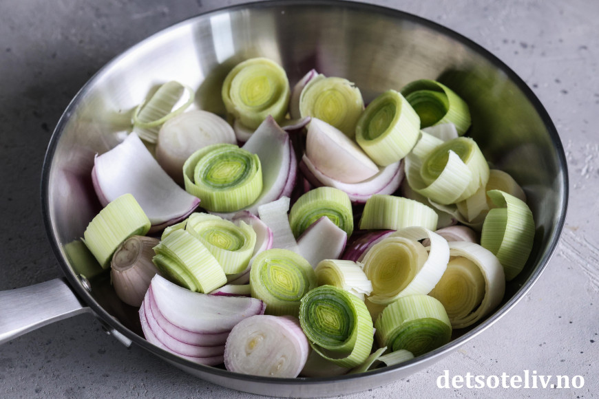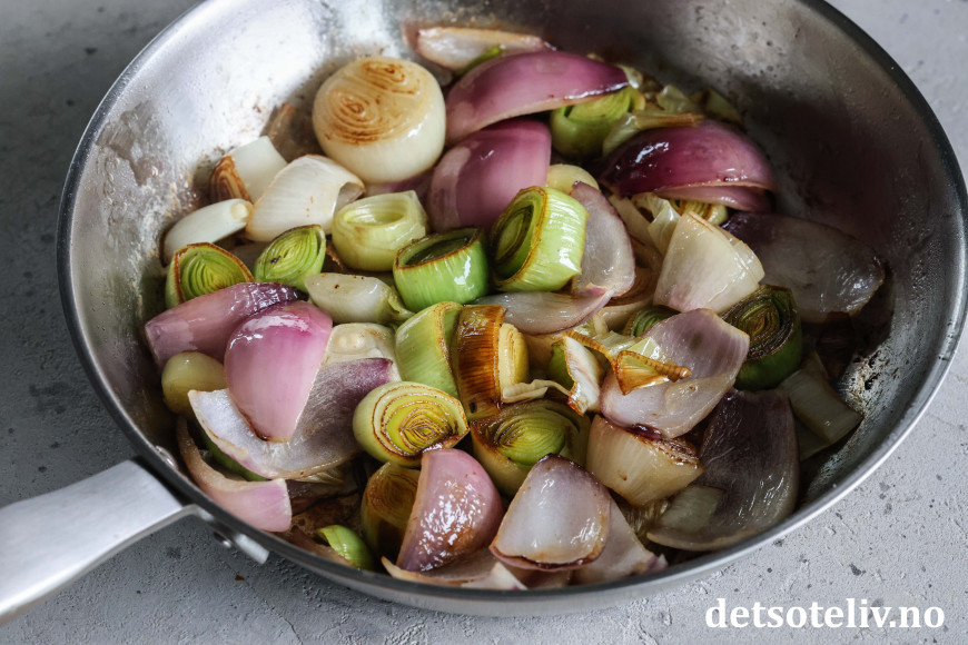 Rens rødløk, purreløk og sjalottløk og skjær i store biter (jeg bruker kun den hvite, nedre delen av purreløken). Ha løken i en stekepanne med 3 ss smør. La løken steke på middels varme til den er myk, blank og gyllen.