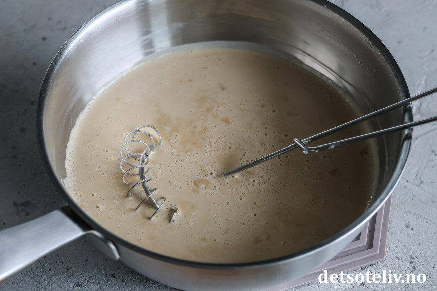Visp sausen sammen og la den koke inn i ca. 10 minutter, slik at en del av væsken fordamper.
