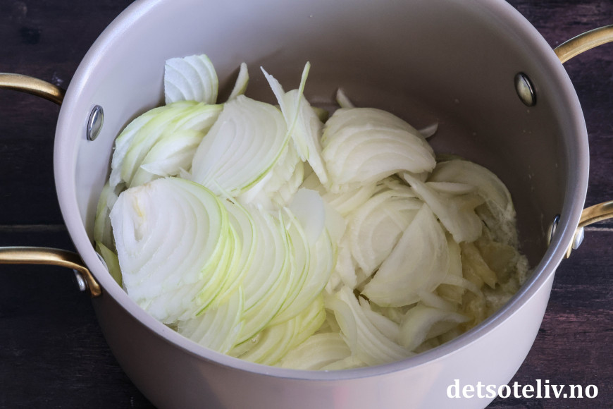 Smelt smøret i en kjele. Skrell og snitt opp løken i fine skiver. Gjør det samme med hvitløksfeddene. Ha løk og hvitløk i kjelen.