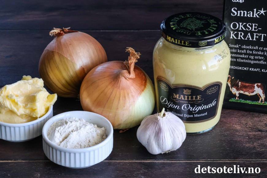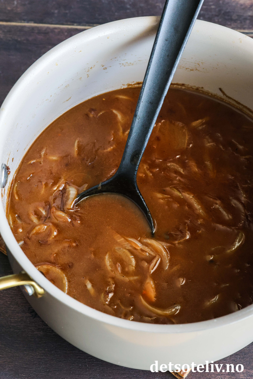 Onion gravy er en tykk, engelsk, brun saus med masse karamellisert løk.
