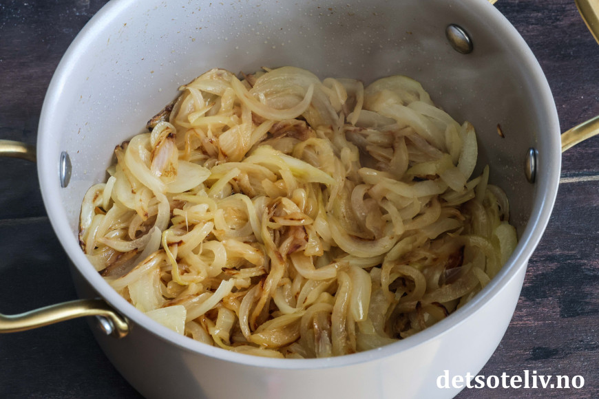 Stek løkene på middels varme til den blir skikkelig myk og karamellisert (dette tar ca. 20 minutter).