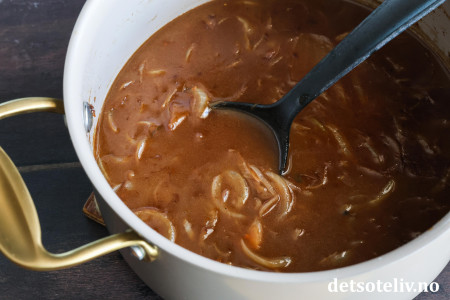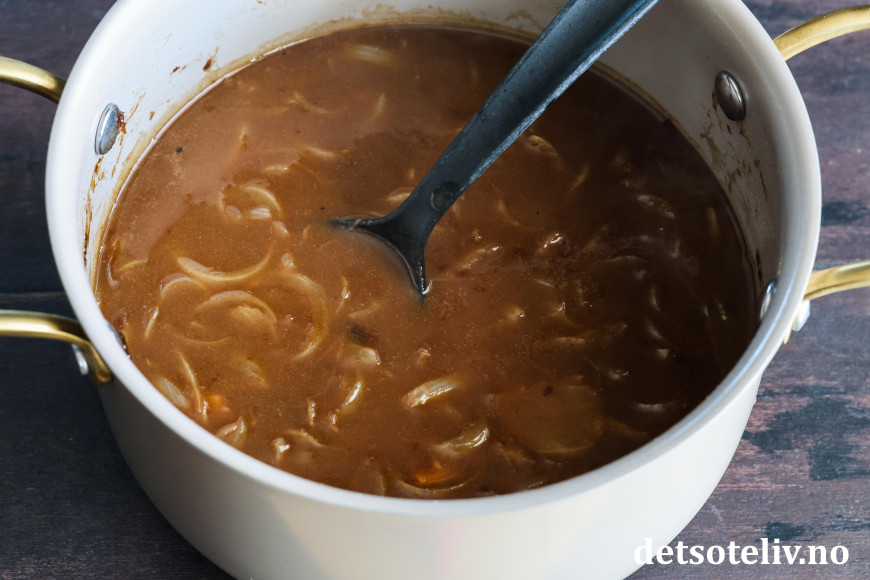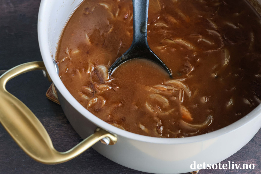Spe deretter med kjøttkraft og rør om. Gi sausen et oppkok og la småkoke i ca. 10 minutter, til du får en tykk, brun løksaus.
